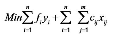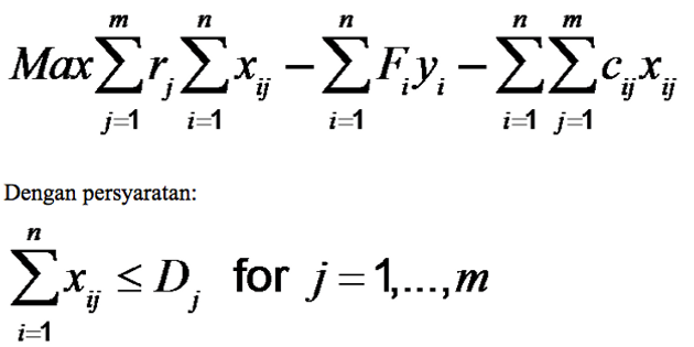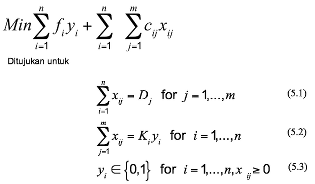 - yi = 1 jika pabrik terletak di tempat i, 0 sebaliknya